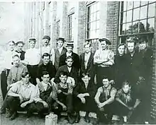 A reporter from the Jeffersonian Democrat visited the factory on May 12, 1905. He found fifteen men busy at work, with several cars in various stages of construction. The factory produced all the parts for the car, except for the wheels, tires and lamps. Robert Twyford himself supervised the chassis and engine shop, along with C. A. French. Ralph Reitz supervised the body shop, where the workmen built the wooden bodies. Figure 4 shows the workers at the factory. Figure 5 shows a picture of a Twyford runabout chassis inside the factory, most likely taken in 1905. This shows the primitive conditions that the workers had to use in manufacturing the automobiles.[14] The parts to the left of the chassis include fifth-wheel gears for the front axle steering mechanism. The plant had the dimensions of 200x50 feet and two stories. It had the most modern equipment for working on both iron and wood.[15]