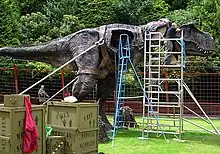 Full size animatronic Tyrannosaurus being assembled in Combe Martin Wildlife and Dinosaur Park, North Devon, United Kingdom.