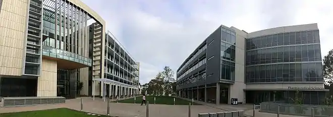 The School of Medicine neighborhood occupies 54 acres on the southern portion of the main campus. It is bordered by Gilman Drive and Revelle College to the west, Gilman Drive and University Center to the north, Villa La Jolla Drive and the San Diego VA Medical Center to the east, and La Jolla Village Drive to the south. The main entrances to the campus are via Library Walk for pedestrians and Osler Lane for vehicles. The neighborhood's buildings are arranged around a series of three green spaces: the School of Medicine Quad, the Ceremonial Green, and the Academic Mall.[8] The School of Medicine quad is an informal, grassy area which channels pedestrians from Revelle College and Library Walk toward Sally T. WongAvery Library and the adjacent academic and research facilities. The Ceremonial Green is a quadrantal lawn which is used for graduation ceremonies and other outdoor functions in front of the Medical Education and Telemedicine Building. The Academic Mall is a structured, flat quadrangle with gathering spaces and academic and research facilities along its east and west edges, and the Rita Atkinson Residences (medical student housing) at its southern terminus.