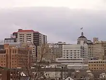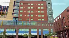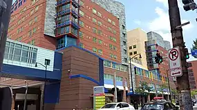 Ground was broken in 1982, and in January 1986 a new tower called the "Main Tower" was opened at the hospital.[7] Opening was delayed after a slight issue led to a leaking pipe.[29] The addition consisted of twelve floors (two underground parking), 210 patient beds, and cost $92 million.[30] The Main Tower had a rooftop heliport and was the location of the emergency department and was connected to the older buildings with connections to UPMC Presbyterian Hospital that were accessed through multiple floors.[31] The new tower also included an underground parking garage, new lobby, pediatric and neonatal intensive care units, operating rooms, and a radiology department shared with the neighboring Presbyterian Hospital.[32][33] The new building opened up with an open house and tours for the public.[34]