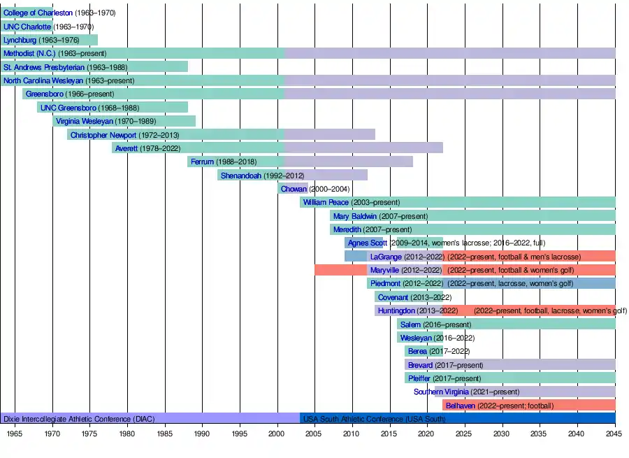 - 1963 - The USA South was founded as the Dixie Intercollegiate Athletic Conference. It was a member of the National Association of Intercollegiate Athletics (NAIA). Charter members included Charlotte College (now the University of North Carolina at Charlotte), the College of Charleston, Lynchburg College (now the University of Lynchburg), Methodist College (now Methodist University), North Carolina Wesleyan College (now North Carolina Wesleyan University), and St. Andrews Presbyterian College (now St. Andrews University), effective beginning the 1963-64 academic year.