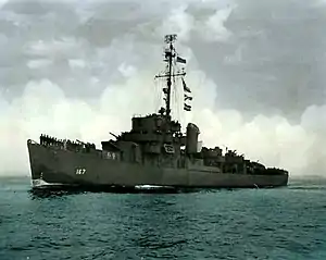 The Acree was named for John White Acree, a LTJG serving aboard the USS Enterprise. Acree died while leading a damage-control party on 26 October 1942 during the Battle of the Santa Cruz Islands.[2] The ship was laid down on 30 November 1942 by the Federal Shipbuilding and Drydock Company, Kearny, New Jersey; launched on 9 May 1943; sponsored by Mrs. John W. Acree, the widow of LTJG Acree; and commissioned at the New York Navy Yard on 19 July 1943.[2]