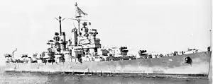 The ship left Pearl Harbor on 9 June to join the fleet at Leyte in the Philippine Islands. She reached San Pedro Bay on 21 June and joined 3rd Fleet.[4] Rather than join the main elements of Task Force 38 for a major attack on Japan, Amsterdam was assigned to a detachment centered on the aircraft carrier Wasp. She formed part of the escort for the carrier, along with the cruisers Oklahoma City, Tucson, and Flint, and seven destroyers. The unit was sent to carry out a raid on Japanese positions on Wake Island on 18 July.[5] By early August, Amsterdam and Oklahoma City had been transferred to Task Group 38.1. Over the next week, she covered the carriers of Task Force 38 during a series of raids on the Japanese home islands. On 15 August, the fleet received word of Japan's decision to surrender.[4][6] By late August, Amsterdam had been transferred to TG 38.2. The ship entered Sagami Bay on 27 August with the rest of TF 38 to begin preparations for the formal surrender of Japan, which took place aboard the battleship Missouri on 2 September.[7] The ship earned one battle star during her short wartime career.[4]