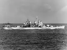 At the start of October, Canberra joined Task Force 38, tasked with performing air raids on Okinawa and Taiwan, in preparation for the landings at Leyte.[3] On 13 October, an air-dropped torpedo from a Japanese aircraft hit the cruiser below her armour belt.[3][4] The explosion killed 23 personnel and exposed the engineering spaces to the ocean, stalling the ship.[3] USS Wichita took Canberra under tow for a rendezvous with the tug USS Munsee, which took over the tow after putting a salvage crew aboard.[5] During the tow, the salvage officer from Munsee was killed while diving in the cruiser's flooded engine room to make temporary repairs.[5] A week into the tow towards Ulithi, Munsee was joined by the War Shipping Administration leased tug Watch Hill.[5] It took another week for the two tugboats to bring Canberra to the repair ship USS Ajax.[5] After temporary repairs at Manus, Canberra sailed under her own power to Boston Navy Yard.[3] The cruiser was docked for repairs, which lasted from February to October 1945.[4] The cruiser was deployed to the west coast of the United States in late 1945.[3]