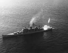 In 1962, she sailed south from Norfolk to participate in the naval blockade during the Cuban Missile Crisis.[8] During the Vietnam War, Canberra was homeported at San Diego. She deployed to Vietnam five times from 1965 to 1969[6] where her 8-inch and 5-inch guns provided support for US troops. During the deployments in 1967 and 1968, Canberra operated north of the DMZ shelling bridges, transport routes and shore installations. On 2 March 1967, the cruiser was hit by two shells fired from ashore,[6] which caused 5 injuries and minor structural damage. On 6 April 1967, a young seaman named Doug Hegdahl was accidentally blown overboard by one of the 5-inch guns; he was captured by a North Vietnamese gunboat and imprisoned in the infamous Hanoi Hilton. Hegdahl's recollections of his time there would later serve as proof of torture committed by the North Vietnamese at POW camps. At the conclusion of her second tour of duty in April 1967, the cruiser visited Melbourne, and was in Australian waters in May for commemorations of the Battle of the Coral Sea.[6][8]
