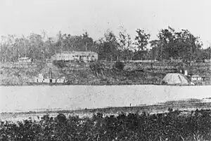 Moored to the river bank above the falls at Alexandria, Louisiana, during the Red River campaign, circa May 1864. USS Dahlia is at left, and USS Neosho is at right.