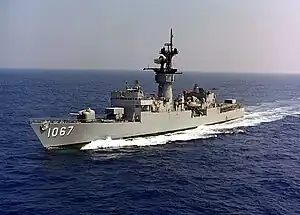 The Knox-class ships were armed with a 5"/54 caliber Mark 42 gun forward and a single 3-inch/50-caliber gun aft. They mounted an eight-round ASROC launcher between the 5-inch (127 mm) gun and the bridge. Close-range anti-submarine defense was provided by two twin 12.75-inch (324 mm) Mk 32 torpedo tubes. The ships were equipped with a torpedo-carrying DASH drone helicopter; its telescoping hangar and landing pad were positioned amidships aft of the mack. Beginning in the 1970s, the DASH was replaced by a SH-2 Seasprite LAMPS I helicopter and the hangar and landing deck were accordingly enlarged. Most ships also had the 3-inch (76 mm) gun replaced by an eight-cell BPDMS missile launcher in the early 1970s.[3]