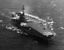 On 21 July 1946, Roosevelt became the first American carrier to operate an all-jet aircraft under controlled conditions. Lieutenant Commander James Davidson, flying the McDonnell XFD-1 Phantom, made a series of successful take-offs and landings as Roosevelt lay off Cape Henry, Virginia.[2] Jet trials continued in November, when Lt. Col. Marion E. Carl, USMC, made two catapult launches, four unassisted take-offs, and five arrested landings in a Lockheed P-80A.[1]
