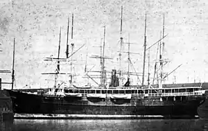 The iron-hulled steamer Gertrude was built in Whiteinch, Glasgow, Scotland as Yard No.100 at the Clydeholm yard of Barclay, Curle & Company as an American Civil War blockade runner and launched on 25 November 1862.[1][2][3] Along with her sistership Emma, she was built for Thomas Stirling Begbie, a London shipowner and merchant.[1] Gertrude was measured as 278grt and 191nrt, with dimensions 164.4 feet length overall, 21.2 feet beam and 12.2 feet depth.[3] She was powered by 2-cylinder oscillating engine of 100nhp, made by John Scott's Greenock Foundry Company, Greenock.[1][3] Gertrude made her first run of the blockade from Nassau, Bahamas to Charleston, South Carolina, arriving 16 March 1863, and returned safely with 820 bales of cotton.[1][4] On her next trip, Gertrude had barely left Nassau when she was chased and captured on 16 April 1863 by the gunboat USS Vanderbilt off Eleuthera Island, Bahamas.[1][5]