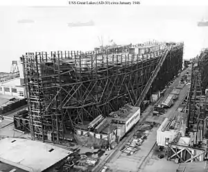 Great Lakes was laid down on 16 April 1945 at the Todd Pacific Shipyard in Seattle. She was cancelled on 7 January 1946, when she was around 20% complete.[1]