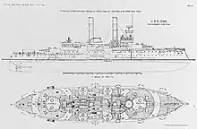 Six 4 in (100 mm)/40 cal quick-firing guns rounded out the secondary battery; these were intended to use their high rate of fire, coupled with high-explosive shells to damage unarmored parts of enemy warships. Four of these were placed in individual casemates in the forecastle deck, two in sponsons in the bow and the other two located amidships. The remaining two guns were in open shielded mounts on the aft superstructure, superfiring over the rear main battery turret.[8] They fired a 33 lb (15 kg) high-explosive shell at a muzzle velocity of 2,000 ft/s (610 m/s).[11] For defense against torpedo boats, the ship carried a battery of twenty 57 mm (2.2 in) 6-pounder Hotchkiss guns and four 37 mm (1.5 in) 1-pounder guns These guns were dispersed around the ship in a variety of individual mounts, including in the fighting top of the military mast, the superstructure, and in sponsons in the hull. She also carried four M1895 Colt–Browning machine guns chambered in 6mm Lee Navy.[7]