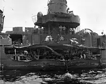 While patrolling with Harry F. Bauer and Ellyson 6 June, J. William Ditter was attacked by a large group of kamikazes. The ship's gun crews downed five of the planes; but a sixth glanced off her No. 2 stack; and another crashed into her on the port side near the main deck. The ship lost all power and suffered many casualties; but damage control kept her afloat until she could be towed by tug Ute to Kerama Retto the next day. Eventually she was repaired enough to steam to Saipan on 10 July and begin the voyage home. She touched at San Diego and the Canal Zone before arriving New York 12 July 1945. J. William Ditter was decommissioned there on 28 September 1945 and was scrapped in July 1946.