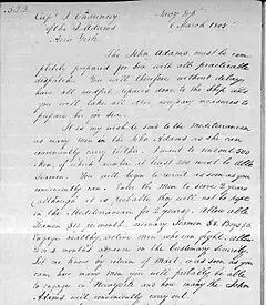 It is my wish to send to the Mediterranean as many men in the John Adams as she can conveniently carry thither. I want to send out 500 Men, of which number at least 200 must be Able Seamen. You will begin to recruit as soon as you conveniently can. Enter the men to serve 2 years (although it is probable they will not be kept in the Mediterranean for 2 years) allow Able Seamen $ 12 per month, Ordinary Seamen $ 8, Boys $ 6. Engage healthy, active men who can fight. Allow 2 to 4 months advance on customary security.[2]