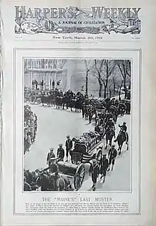 A wreath of galax leaves was provided for each casket, which was also draped with an American flag.[29][79] Each coffin was placed next to an open grave.[29] Once the funeral cortege departed, two companies of bluejackets and a battalion of U.S. Marines acted as honor guards for the dead. They were joined by the United States Marine Corps Band.[81] Captain Sigsbee was in command of the three honor guards.[78][79] A small dais draped in red, white, and blue was provided for the speakers and officiators.[78] President McKinley, his Cabinet, Admiral George Dewey, Lieutenant General Nelson A. Miles, Lieutenant Commander Richard Wainwright (former Executive Officer of the Maine), Lieutenant Frederic C. Bowers (former Passed Assistant Engineer aboard the Maine), and Coal Passer Jeremiah Shea attended the ceremony.[29][79]