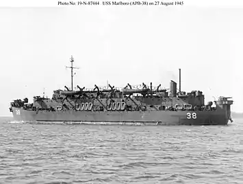 Authorized to be built as APL-38 on 17 December 1943, Marlboro was redesignated APB-38 on 8 August 1944. She was laid down by the Boston Navy Yard at Boston, Massachusetts, on 25 August 1944 and launched on 17 November 1944; sponsored by Mrs. Marjorie Guile. Marlboro was commissioned 18 August 1945. Assigned to the Atlantic Fleet, Marlboro departed Boston 14 September for shakedown in Chesapeake Bay. On 15 October Marlboro got underway from Naval Operating Base, Norfolk, Virginia, for duty with the Service Force out of New York City. She served as a barracks ship along the East Coast to the end of the year. On 8 January 1946, she steamed for the Caribbean, arriving 5 days later at Guantanamo, Cuba, where she remained until sailing 15 May with U.S. Marines embarked for the East Coast. Marlboro reached Norfolk on the 20th.[2]