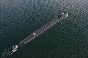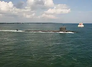 USS North Dakota (SSN-784) is a Virginia-class nuclear powered attack submarine of the United States Navy. She is the second U.S. Navy vessel to be named for the U.S. state of North Dakota, the first being World War I-era battleship USS North Dakota (BB-29). The contract to build her was awarded to Electric Boat division of General Dynamics in Groton, Connecticut, on 14 August 2003. Her name was announced on 15 July 2008.[6] and her keel was laid down on 11 May 2012.[7] She was floated on 15 September 2013 and was christened on 2 November 2013, sponsored by Katie Fowler, wife of Vice Admiral Jeff Fowler.[8] She was commissioned in Groton, Connecticut, on 25 October 2014.