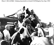 On 17 September 1950 a pair of Grumman F9F-2 Panthers launched from the deck of Philippine Sea. VF-112 Ensign Edward D. Jackson Jr. was leading a section dispatched to strafe an airfield near North Korea's capital, Pyongyang.[31] Flying on his wing was Ensign Dayl E. Crow. The airfield turned out to be little more than a grass strip littered with burned and shattered Soviet-built war machines. After strafing a locomotive and setting it ablaze, the jets turned north and started down the Han River.[32] Soon, Jackson spotted about 75 river boats. When they starting receiving small arms fire from "passengers" on the vessels, Crow followed Jackson down as they made a low strafing pass, splintering many of the small craft with 20 mm cannon fire. After the pass both attackers started to climb from 50 feet (15 m) AGL. Jackson then flew through an aerial booby trap: steel cables strung across the Han to "clothesline" low flying planes. The Panther ripped through the cables like twine, but the whipsawing cable strands caught the starboard wing, shredded the wingtip tank and snapped across the canopy, punching out the windscreen and side windows. The impact knocked Jackson unconscious with severe facial injuries.[31] Crow, flying just astern noticed something wrong, then saw the crushed wing tank and shattered canopy, its inner surface misted with blood. After 20 seconds[33] Jackson regained consciousness and found himself blinded by shards of Plexiglas and blood. Crow was able to guide his leader towards the Yellow Sea, but Jackson was fading in and out of consciousness. With only the left flap down due to damage to the right wing the Panther approached the ship and with the help of LSO Lt.j.g. "Les" Bruestle[33] and Crow the blind pilot trapped the #4 wire on the first attempt. Jackson survived with 36 stitches and an emergency blood transfusion.[32]