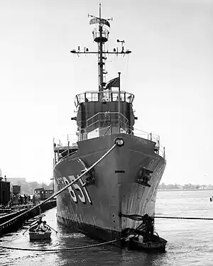 On 15 October 1951 she was re-designated as EPCER-851, or experimental patrol craft escort rescue, for use out of Washington DC with the Naval Research Laboratory.[5] At some point with the designation, she was disarmed. Her complement would also change to 5 officers, 55 enlisted, and 12 technical/scientific personnel.[8] She conducted a variety of experiments with the laboratory, including sonar effectiveness,[9] acoustic surveys,[10] and oceanic mapping.[11]