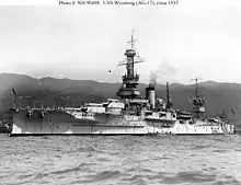 USS Wyoming (BB-32) was the lead ship of her class of dreadnought battleships and was the third ship of the United States Navy named Wyoming, although she was only the second named in honor of the 44th state.[lower-alpha 1] Wyoming was laid down at the William Cramp & Sons in Philadelphia in February 1910, was launched in May 1911, and was completed in September 1912. She was armed with a main battery of twelve 12-inch (305 mm) guns and capable of a top speed of 20.5 kn (38.0 km/h; 23.6 mph).