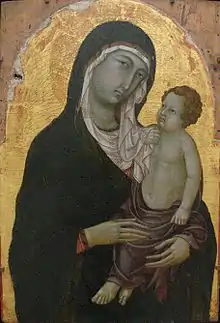 Virgin and Child, 1315–1320, Sienne. Notice the Pseudo-Kufic inscriptions on the veil of the Virgin.