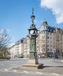 Uhrtürmchen (lit.'clock turret') is a protected monument in Frankfurt am Main, Germany, located at the corner of Friedberger Anlage near the Zoo. It is one of only two remaining clock towers in the city, the other being located in Bornheim,[1][2] and is the oldest surviving one, having been first erected in the 19th century. Today the tower serves as a popular tourist attraction,[3] as well as a meeting point for people in the city.[4]