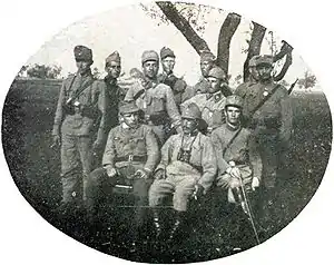 Sotnyk Y. Budzynovskyi with his sotnia staff of the Ukrainian Sich Riflemen.