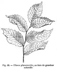 The elm cultivar Ulmus 'Planeroides' [:Planera-like elm] was described by Carrière in the Revue horticole, 1875.[1] It was considered "possibly Ulmus carpinifolia" [:U. minor ] by Green.[2]