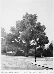 Moss's "type" tree stood by Christ's Pieces, Cambridge, at the junction of Parker Street and Emmanuel Road[12][13] (also described as "on the pavement near the junction of Drummer Street and Emmanuel Road"[11]) and was (1932) 77 ft (23 m) high, with a diameter of 5.5 ft (1.7 m) towards the base and the branches spread 72 ft (22 m) across.[14] In 1954 the tree, which had lad lower horizontal branches removed in the 1940s, had a bole-girth of 16 feet and was estimated to be about 250 years old. In addition to F. G. Preston's c.1914 photograph, a second photograph of the tree, showing its tortuous winter branching, appeared in the Cambridge Daily News in 1954.[11] Shortly after, the tree was propagated by the University Botanic Garden, and severely pruned owing to decay.[11]