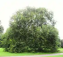 Ulmus villosa, the cherry-bark elm or Marn elm, is one of the more distinctive Asiatic elms, and a species capable of remarkable longevity. It is endemic to the valleys of the Kashmir at altitudes of 1,200–2,500 metres (3,900–8,200 feet) but has become increasingly rare owing to its popularity as cattle fodder. Mature trees are now largely restricted to temples and shrines where they are treated as sacred.[1] Some of these trees are believed to be over 800 years old.[2]