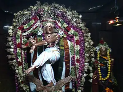 The temple priests perform the pooja (rituals) during festivals and on a daily basis. Like other Shiva temples of Tamil Nadu, the priests belong to the Shaivaite community, a Brahmin sub-caste. The temple rituals are performed six times a day; Ushathkalam at 5:30 a.m., Kalasanthi at 8:00 a.m., Uchikalam at 10:00 a.m., Sayarakshai at 6:00 p.m., Irandamkalam at 8:00 p.m. and Ardha Jamam at 10:00 p.m. Each ritual comprises four steps: abhisheka (sacred bath), alangaram (decoration), neivethanam (food offering) and deepa aradanai (waving of lamps) for both Uma Maheswarar and Mattuvar Kuzhal Amman. The worship is held amidst music with nagaswaram (pipe instrument) and tavil (percussion instrument), religious instructions in the Vedas read by priests and prostration by worshippers in front of the temple mast. There are weekly rituals like somavaram and sukravaram, fortnightly rituals like pradosham and monthly festivals like amavasai (new moon day), kiruthigai, pournami (full moon day) and sathurthi. Abhishekam is done to Lord Nataraja 6 times in a year. Maasi, Avani, Puratasi on Valarpirai Chathurtasi thithi days, and Chithirai Thiruvonam, Aani Uthram, Marghazi Thiruvathirai star days [2] The temple is counted as one of the temples built on the banks of River Kaveri.[3]