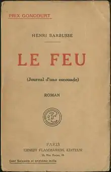 Under Fire: The Story of a Squad (French: Le Feu: journal d'une escouade) by Henri Barbusse (December 1916), was one of the first novels about World War I to be published. Although it is fiction, the novel was based on Barbusse's experiences as a French soldier on the Western Front. It was awarded the Prix Goncourt in 1916. The novel is described as one of the earliest works of the Lost Generation movement[1] or as the work which started it;[2] the novel had a major impact on the later writers of the movement, namely on Ernest Hemingway[3] and Erich Maria Remarque.[4]