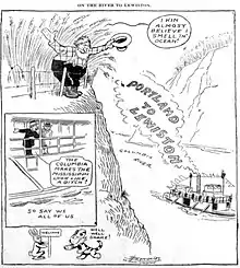 Cartoon published in the Morning Oregonian, marking the transit of Undine from Portland to Lewiston, Idaho through the newly completed Celilo Canal, May 1915