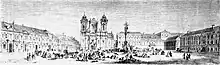Until 1716, the current square was crossed diagonally, from the southeastern to the northwestern corner, by the entrenchment of the Turkish fortress.[3] The idea of creating a rectangular square in the northern part of the fortress was first circulated in 1733.[4] It was not until 1740 when the entrenchment began to be demolished.[3] Later, the moat was filled with earth and the square was paved with natural stone.[3] The last remains of the fortifications existed in the square until 1745–1746. Prior to these years, it was decided to expand the square to the west, becoming the largest of the fortress squares: 150 × 100 m.[4]