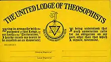 The United Lodge of Theosophists or ULT is an informal and wholly voluntary association of students of Theosophy. It was founded in 1909, mainly through the efforts of Robert Crosbie.[1] The first parent lodge of the ULT was started in Los Angeles by Robert Crosbie and seven other associates through the adoption of its Declaration on February 18, 1909.[2] Owing largely to the revival efforts of B.P. Wadia [1] after Crosbie's death, there are currently about twenty active lodges spread all over the world.[3] The ULT is considered to be part of the second generation [4] or the third section [2] of the Theosophical Movement started in 1875 by H.P. Blavatsky in New York. Presently, it is also one of the existing four main "branches" of the original Theosophical Movement.[5] The following founding principles [6] when taken as a whole, sets apart the ULT from the other Theosophical Organizations: