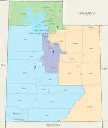 Geographical location of Utah's four congressional districts to the United States House of Representatives since 2023.