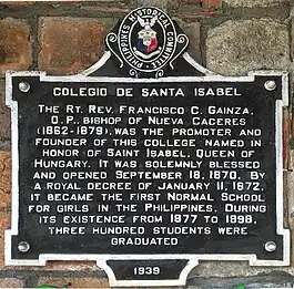 A Royal Decree of Queen Isabella II of Spain dated January 11, 1872, granted to the Lord Don Fray Francisco Gainza, Bishop of Nueva Caceres, the authority to create a school for girls (escuela de niñas) which will be under the care of the Hijas de Caridad (Daughters of Charity). Consequently, Colegio de Sta. Isabel became the first normal school for girls in the Philippines and Southeast Asia under the name Escuela Normal de Maestras.[3]