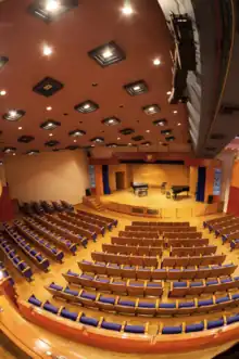 The university has its own performance venue, with a 2,000 seat auditorium and a stage. Its official name is the Ceremonial Amphitheatre (in Greek: Αμφιθέατρο Τελετών) and it is used for the performances of the music department, theatrical plays, as well as all the official ceremonies of the university, such as graduations. In 2012, vandals entered the space and burnt a 35,000 Euro piano. The remains of the burnt piano have been turned into an artwork, a monument against violence, placed at the entrance of the space.[19][20]