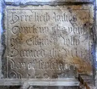 "Here lieth James Courteny The Younger Estquier who deceased the viii day of September A(nn)o D(o)m. 1592".