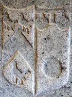 Ledger stone of Gertrude Courtenay (1592-1666), heiress of Upcott, wife of John I Moore (1582-1641), in St Matthew's Church, Cheriton Fitzpaine, with detail of escutcheon right showing arms of Moore quartering Courtenay, the latter with a crescent for difference