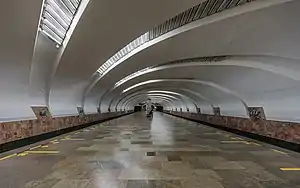 The monolithic vault of the station is cut with parallel edges along diagonal channels. As conceived by the authors, the ceiling should resemble the thread of a screw, or the shape of giant machines and give the station an industrial flavor. The design used cast iron: patterned metal plates, small parts and original fittings. The color scheme of the interior is calm, restrained, without much richness and variety of natural stone. The side walls are made of gray and gray-white Nizhny Tagil marble, the floor on the platform is paved with granite slabs. The bas-reliefs on the end walls, dedicated to the workers of Uralmash, were created by the sculptor Vladimir Yegorovich Egorov and the letters in the word "Uralmash" were done by Vyacheslav Butusov.[3]
