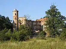 The main church, the Church of Archangel Michael, was mentioned in 1218. The present church was built in 1750–1789 in the Baroque style. It was restored in the 19th century, but burned down in 1945. It was subsequently rebuilt in 1951-1953 by the priest Franciszek Dorżyński. In 1970 a new interior with polychrome was added. In 1997, the church was flooded to a height of 40 cm. In the years 1997–2000 it was renovated. In the church there are sculptures brought by repatriates from Navaria, near Lviv.[2] There is the ruins of a castle, Zamek Uraz, (Uraz Castle), dated to 1319, which was destroyed by the 1950s.[3]