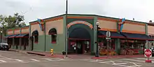 1907 | Only Art Deco style building in Historic District[1] | Originally five smaller buildings combined and covered with stucco; housed grocery, hardware, department stores and bakery[2] |
