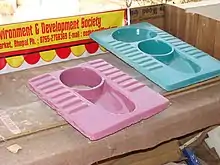 Two-hole (pink) and three-hole (blue) urine diversion ceramic squatting pan from Indian NGO EEDS