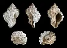Shell of Urosalpinx mengeana (Dorsal, lateral (right side), ventral, back, and front view. length 3.0 cm)