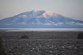Ute Mountain is part of the Taos Mountains which are a subset of the Sangre de Cristo Mountains.[3] The isolated landmark is the highest point of the Cerro del Yuta Wilderness and Rio Grande del Norte National Monument which is administered by the Bureau of Land Management.[4] The remote mountain is situated 35 miles north of the town of Taos and four miles south of the New Mexico–Colorado border. Ute Mountain is a free-standing, dacitic, extinct Pliocene volcanic cone set within the Taos Plateau volcanic field.[8] Ute Mountain has a base diameter of five miles and topographic relief is significant as the summit rises 2,500 feet (760 meters) above the surrounding sagebrush-covered basalt plains.[2] The slopes of the mountain are covered with stands of pinyon pine, ponderosa pine, aspen and Douglas fir.[9] Precipitation runoff from the mountain drains to the Rio Grande which flows through a gorge along the western base of the mountain.