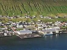 Vágs Havn is the harbour of Vágur. The fjord is 10–15 metres deep where the harbour is. The municipality of Vágur dredged it deeper in 2004, which was a big investment. There are fish factories in the harbour. There is also a ferry port, where the ferry MS Smyril used to sail to a few times every week, now it only comes to Vágur once every three weeks in order to bunker (refuel) from the Vágsverkið of SEV, which is on the south side of the fjord.[1] When the ferry comes to bunker, Smyril first arrives to the port at the northern side in order to let people and cars on shore, after that the ferry sails across the fjord to bunker. After the bunkering, the ferry sails across the fjord again in order to take passengers and cars and cargo on board. Smyril's port in Suðuroy is on Krambatangi in Tvøroyri municipality since the arrival of the current ferry in 2005.
