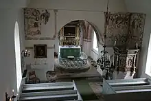 Despite its reconstruction in the 19th century, the church still retains several medieval murals. The vaults in the chancel date from the second half of the 15th century, and depict the Last Judgment, and a row of apostles. The wall separating the nave from the chancel also has partially preserved murals, older than those in the chancel and dating from the first half of the 15th century. They depict several scenes from the life of Christ, including the Last Supper and the Annunciation. Lastly there is also a set of murals decorating the vaults of the tower. These are from the 1520s and are more anecdotal, showing fables with religious overtones, including a scene of two foxed preaching for a flock of geese, an allegorical criticism of Lutheranism, which was gathering support at the time.[1]