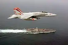 In June 1990, the squadron received its first F/A-18C Hornet and was redesignated Strike Fighter Squadron 94 (VFA-94) on 1 January 1991.[3] In May 1991, it deployed aboard USS Abraham Lincoln to the Persian Gulf in support of United Nations sanctions following the war in Iraq. The squadron also participated in Operation Fiery Vigil, evacuating thousands of homeless people from the Philippines after the Mount Pinatubo eruption. It subsequently received the Joint Meritorious Unit Commendation for its contribution to the disaster relief efforts.