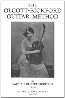 Olcott-Bickford moved to New York in 1911 where she began performing and teaching. Among her early students were Cornelius Vanderbilt and Bernard Baruch.[5] She met Evangeline Adams who helped her choose her stage name, Vahdah.[5] In 1919 she became the first woman to make a guitar recording.[5] In 1923, she moved back to Southern California and was instrumental in founding the American Guitar Society in Los Angeles.[6][5][1] She taught at the Zoellner Conservatory of Music in Los Angeles, wrote articles espousing the beauty of the guitar, and won music competitions.[1] Ron Purcell, late professor of music at California State University, Northridge, was her student from 1955 when he studied at the Los Angeles Conservatory of Music and Arts.[7] He and other pupils were taught guitar playing in the music room at her house in the Hollywood Hills where she taught a technique of playing with the right hand using the pads of the fingers to pluck the strings, rather than the fingernails.[7]