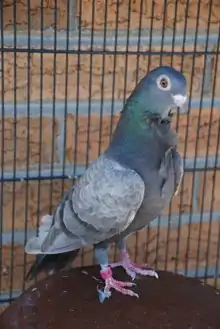 The Valencian Figurita is a breed of fancy pigeon developed over many years of selective breeding.[1] It originated in Valencia, Spain hundreds of years ago and is the smallest (4-6 ounces) of the many fancy pigeon breeds. The breed is promoted by the Valencian Figurita and Italian Owl Club in the United States, by the Figurita Club Nederland[2] in the Netherlands, and by the Figurita-Movchen-Club Deutschland in Germany. Valencian Figuritas are bred in the colors black, red, yellow, silver, blue, white, dun, ash-red, and blue and red grizzle. It also appears in the patterns bar, check, and spread.